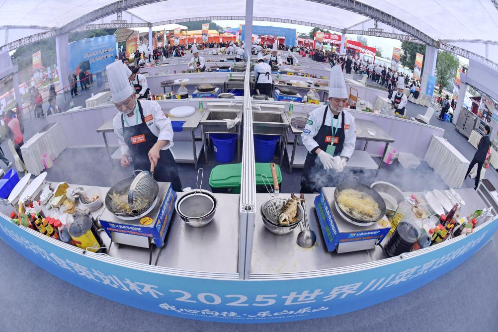 11月1日,第八届世界川菜大会在四川乐山举行。厨师在2025世界川菜烹调妙技大赛比赛中。新华社发(李向雨摄)