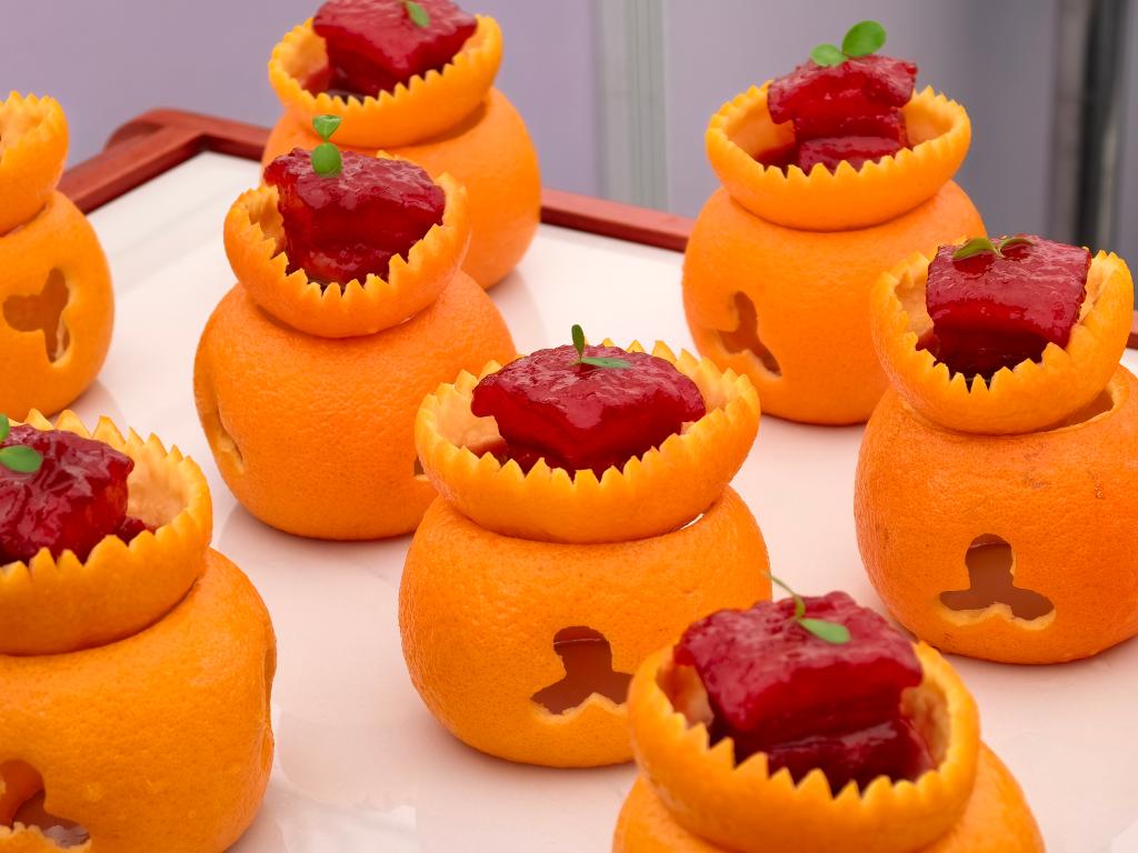 11月1日,第八届世界川菜大会在四川乐山举行。在2025世界川菜烹调妙技大赛现场,“橙香方肉”清新出炉。新华社记者边想琪 摄