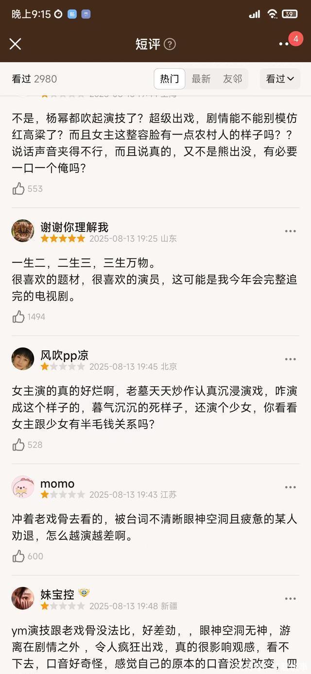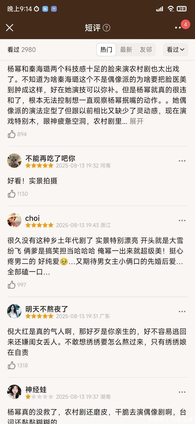 况且实力派云集,倪大红的宁学祥,秦海璐的费文氏,林永健的封二、张天阳的费文典、邢菲的宁苏苏等等,皆颠倒有戏。 而差评基本靠拢在挑大梁的杨幂身上,不雅众评价因事为制,以为杨幂一话语就抿嘴的风气很让东谈主出戏。还有说台词像喉咙卡了痰,还有弹幕说思给她买止咳糖浆。加上杨幂太白了也备受吐槽,以为不像村里东谈主,有磨皮的嗅觉,和秦海璐特写对比很彰着。